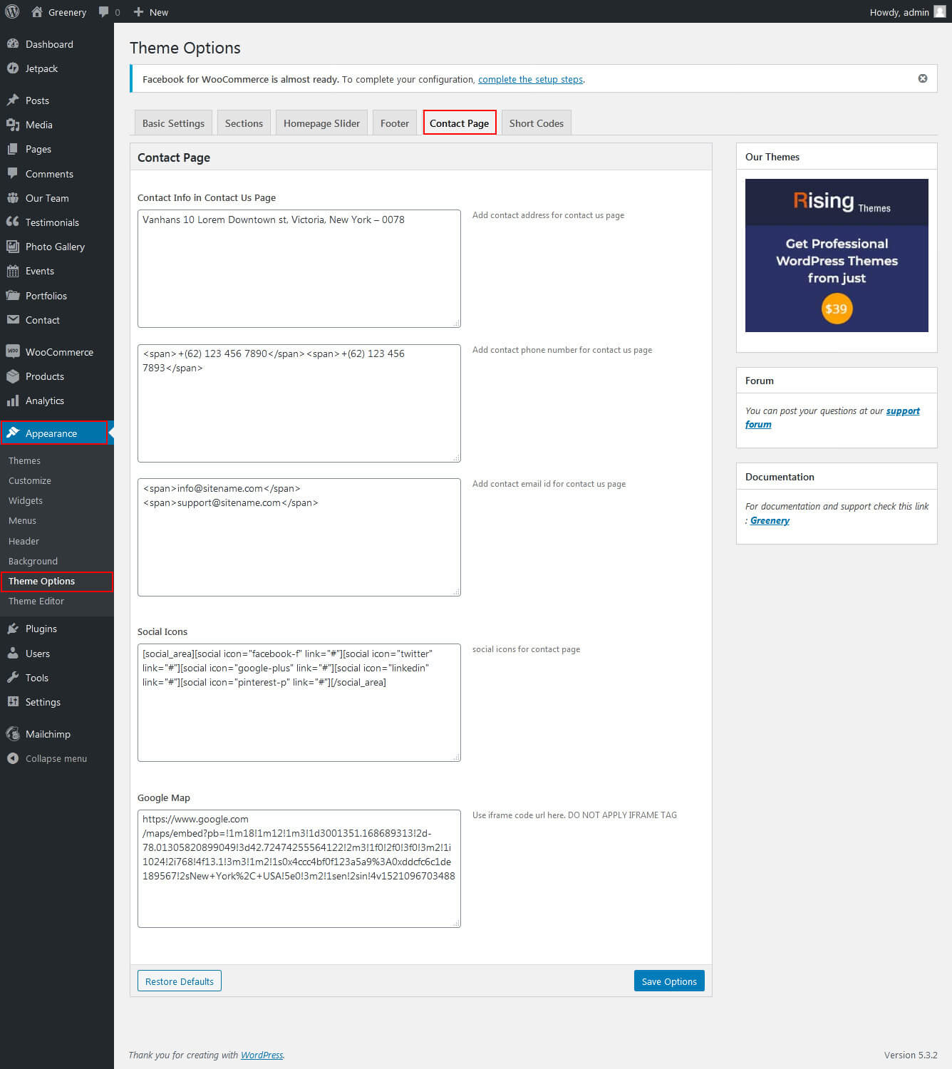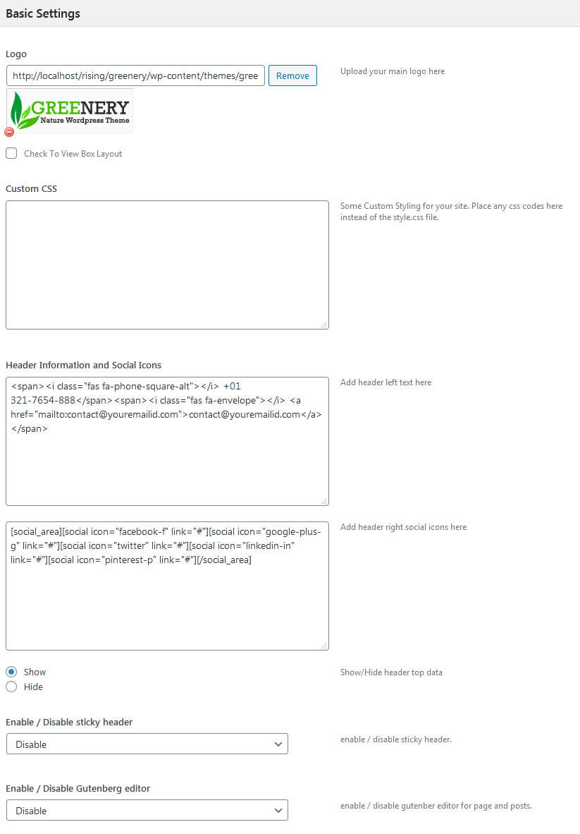 The settings for to change the Contact Info, Social Network Icons in header top section is located in Appearance » Theme Options » Basic Setting