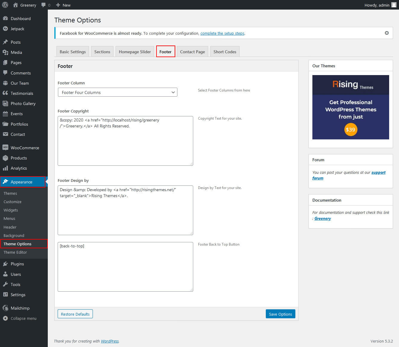 To manage footer section go to the Appearance » Theme Options » Footer