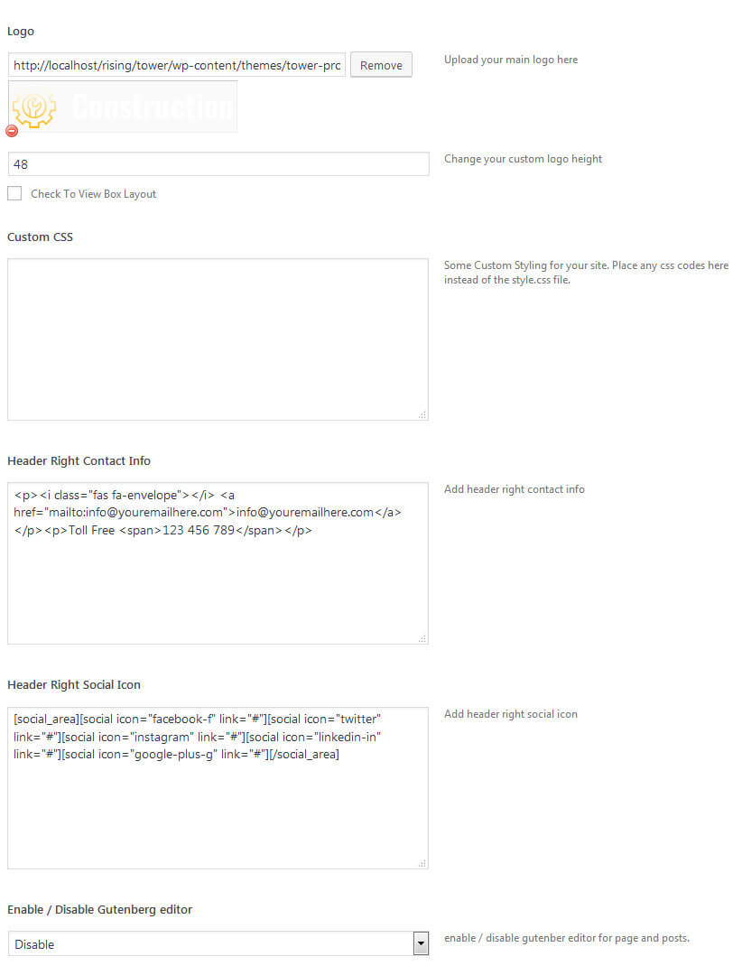 The settings for to change the Contact info and Social Network Icons in top header section is located in Appearance » Theme Options » Basic Setting
