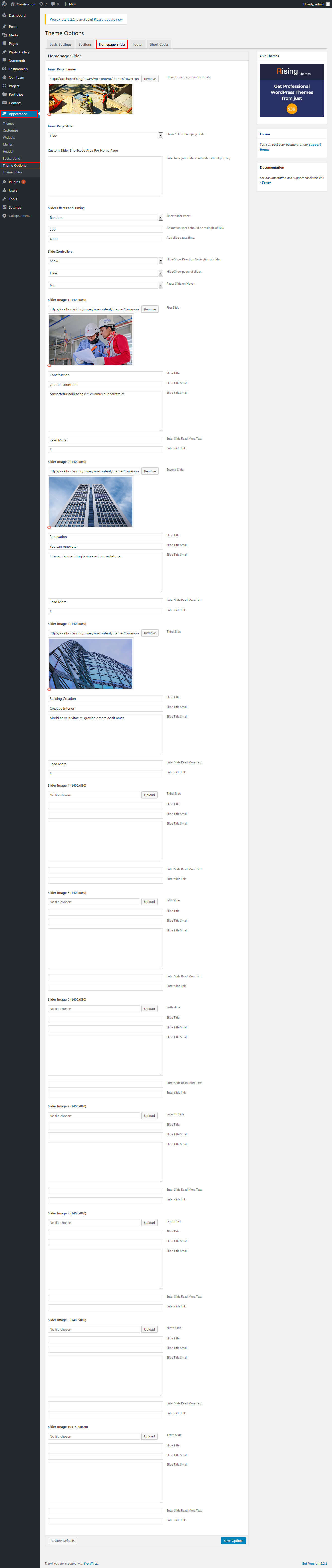 In order to add slides to homepage slider go to the Appearance » Theme Options » Homepage Slider