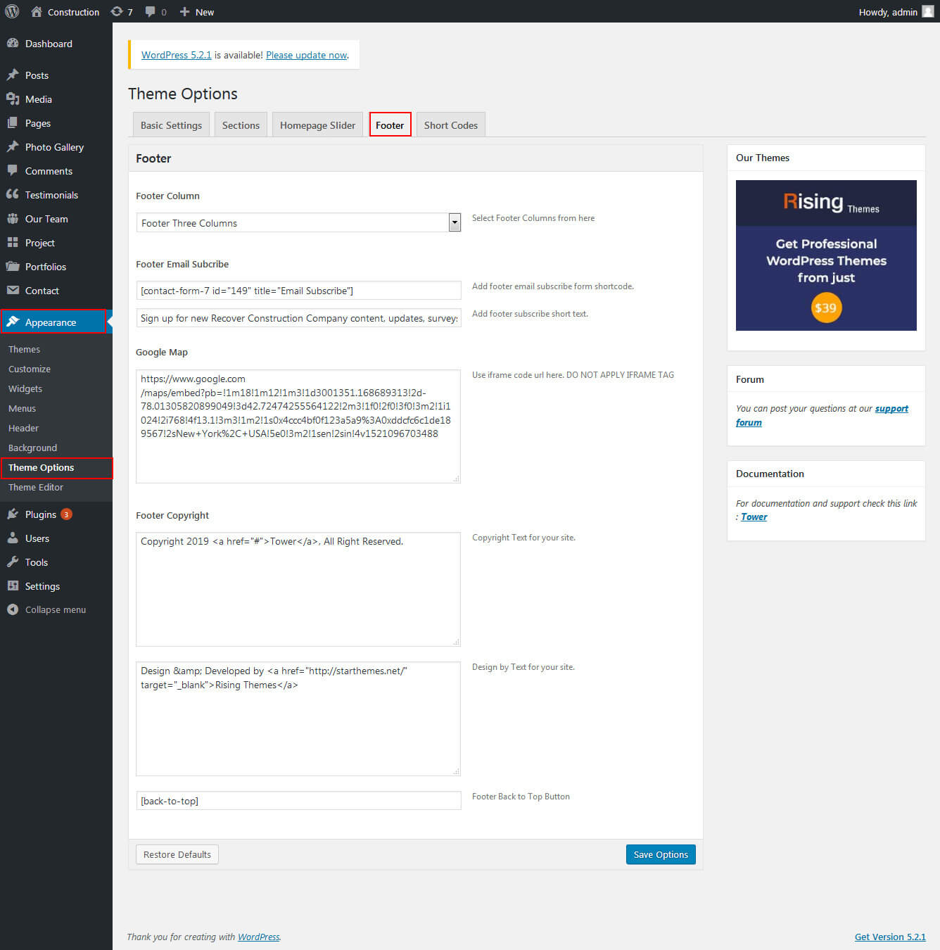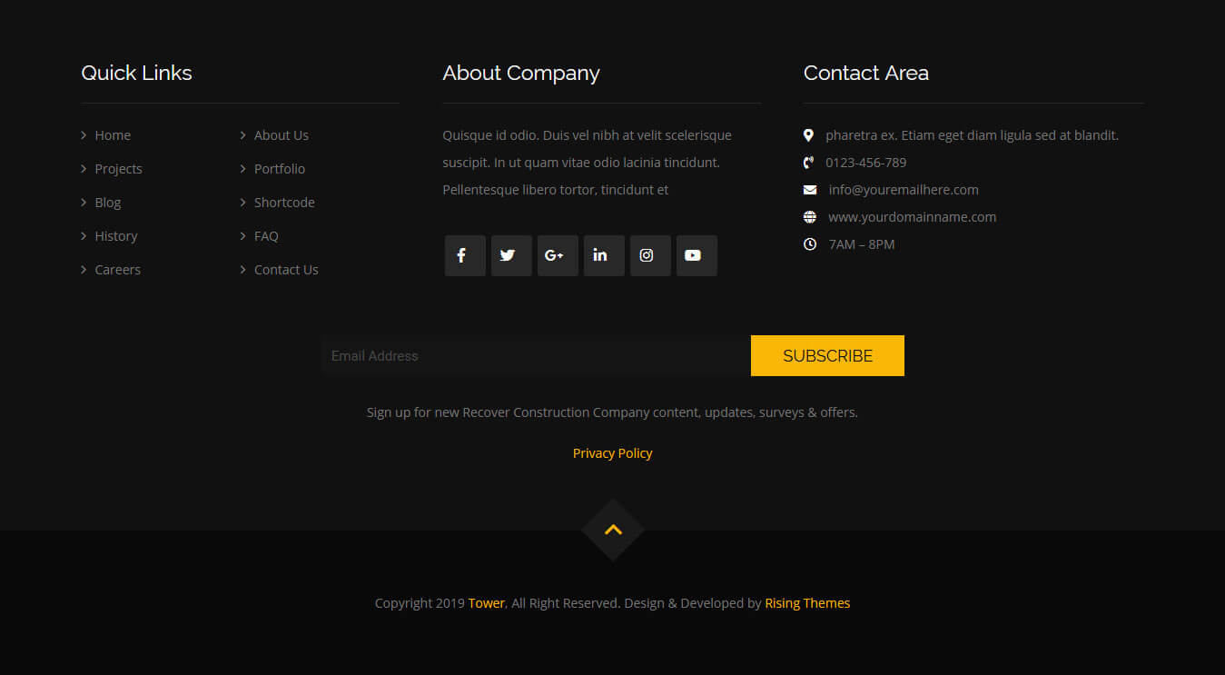 To manage footer section go to the Appearance » Theme Options » Footer
