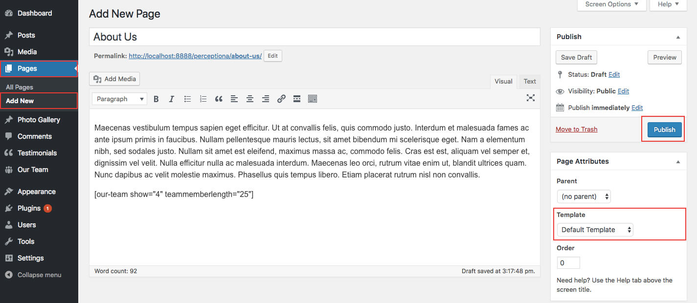 When you create a new page from the Pages » Add New section, the "Default Template" is assigned to the page by default. The default page template is a standard page template that can be with a sidebar or full-width layout and can contain custom content.