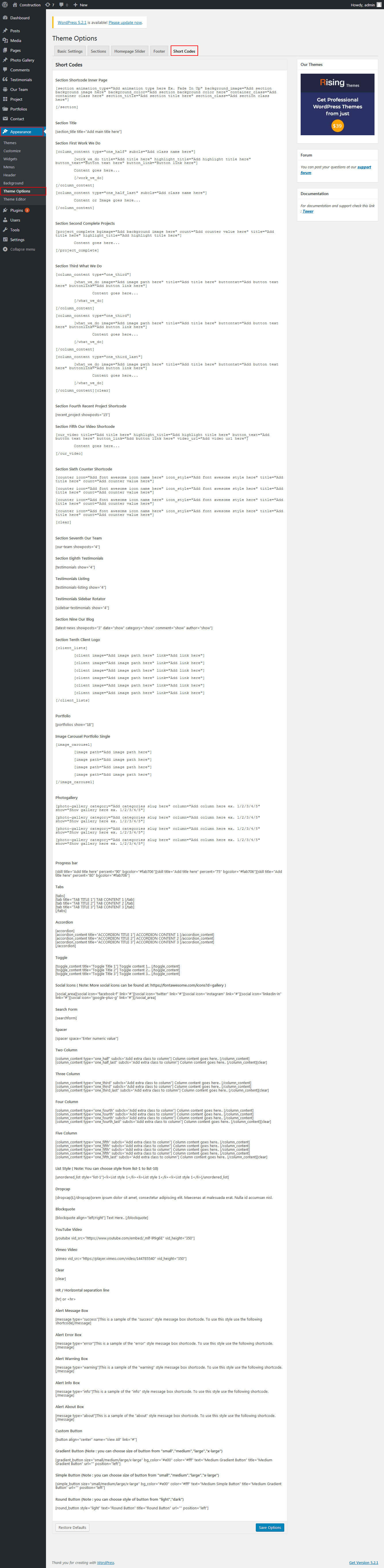 To view all shortcodes go to Appearance » Theme Options » Short Codes: