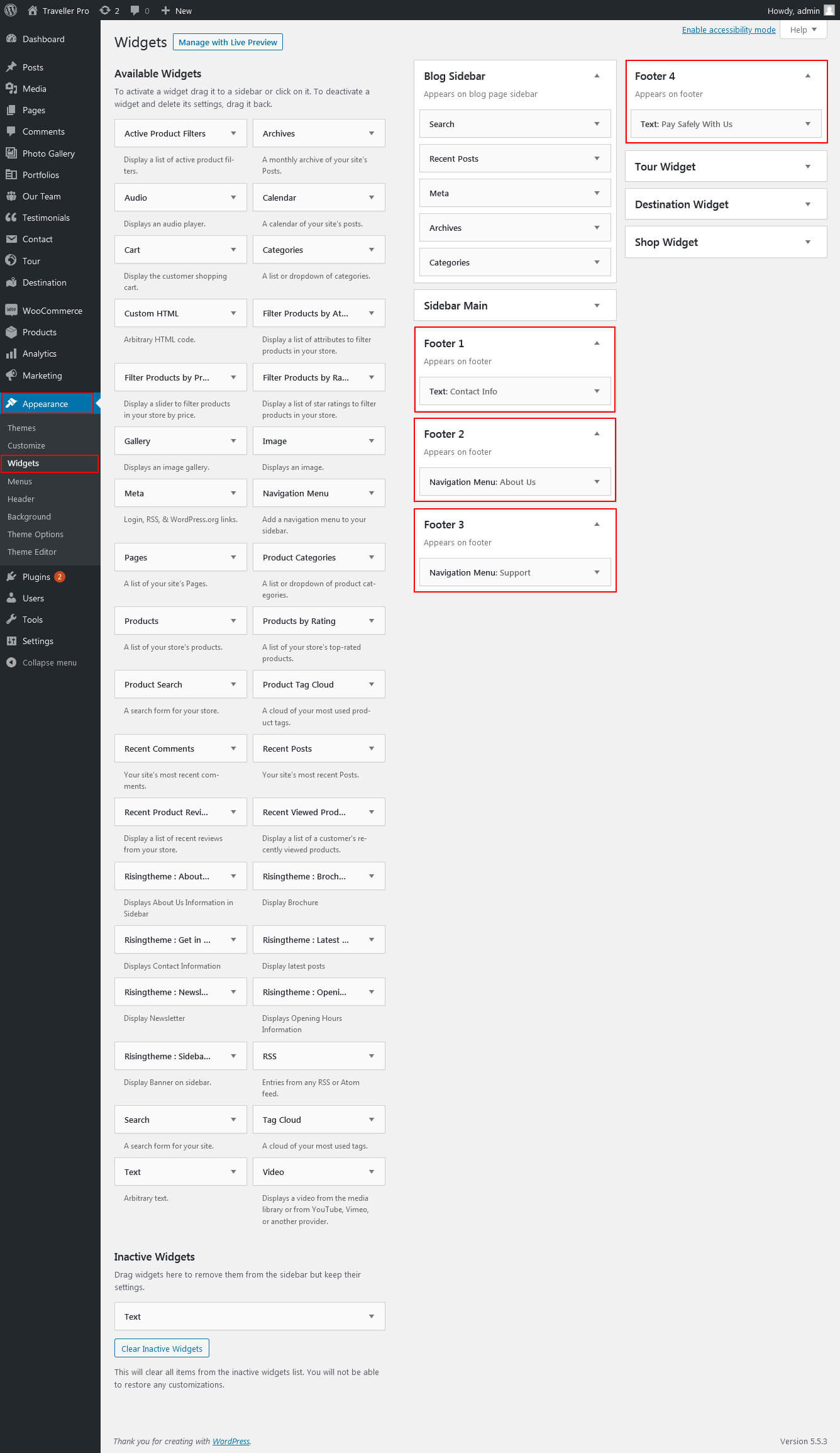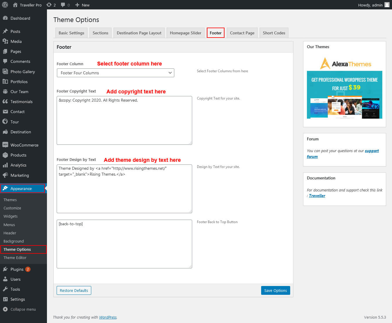 To manage footer section go to the Appearance » Theme Options » Footer
